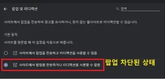크롬 열기 → 우측 상단 점 3개 탭 → 설정 → 사이트 설정 → 팝업 및 리디렉션 → 허용 토글 ON.